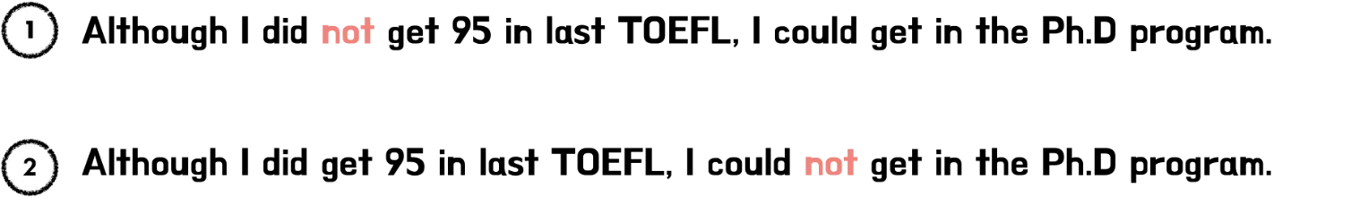 위 두 문장을 해석해보면, 1번 문장은 “지난 토플시험에서 95점을 못 받았지만, 박사과정에 입학할 수 있었다”이고, 2번 문장은 “지난 토플 시험에서 95점을 받았지만, 박사과정에 입학하지 못했다"가 된다. NOT의 위치 차이로 인해 두 문장의 뜻이 완전히 달라져버렸다. 이와 같이 문장 내의 정확한 단어 위치를 알 수 없다면 문장의 뜻이 완전히 달라지는 문제가 발생할 수 밖에 없다.