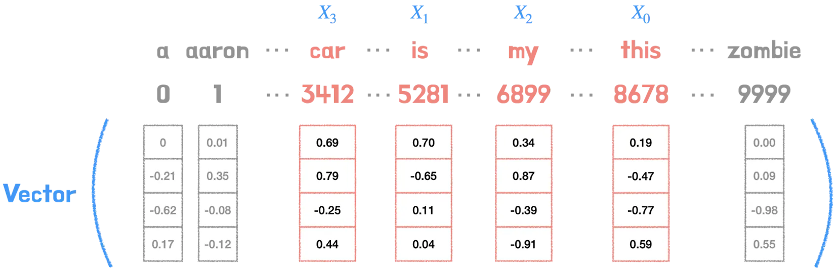 위 그림을 예를 들어 설명하자면, car와 this 두 단어의 벡터 값을 벡터공간에 나타냈을 때, 서로 다른 두 단어가 공유하는 피처값이 존재하고 문맥상 유사도가 높다면, 임베딩 벡터값은 점점 가까워질 것이다. 반면에 zombie의 경우, 공유하는 피처값이 없고 문맥상 유사도도 낮아서 임베딩 벡터값은 가까워지지 않는다.