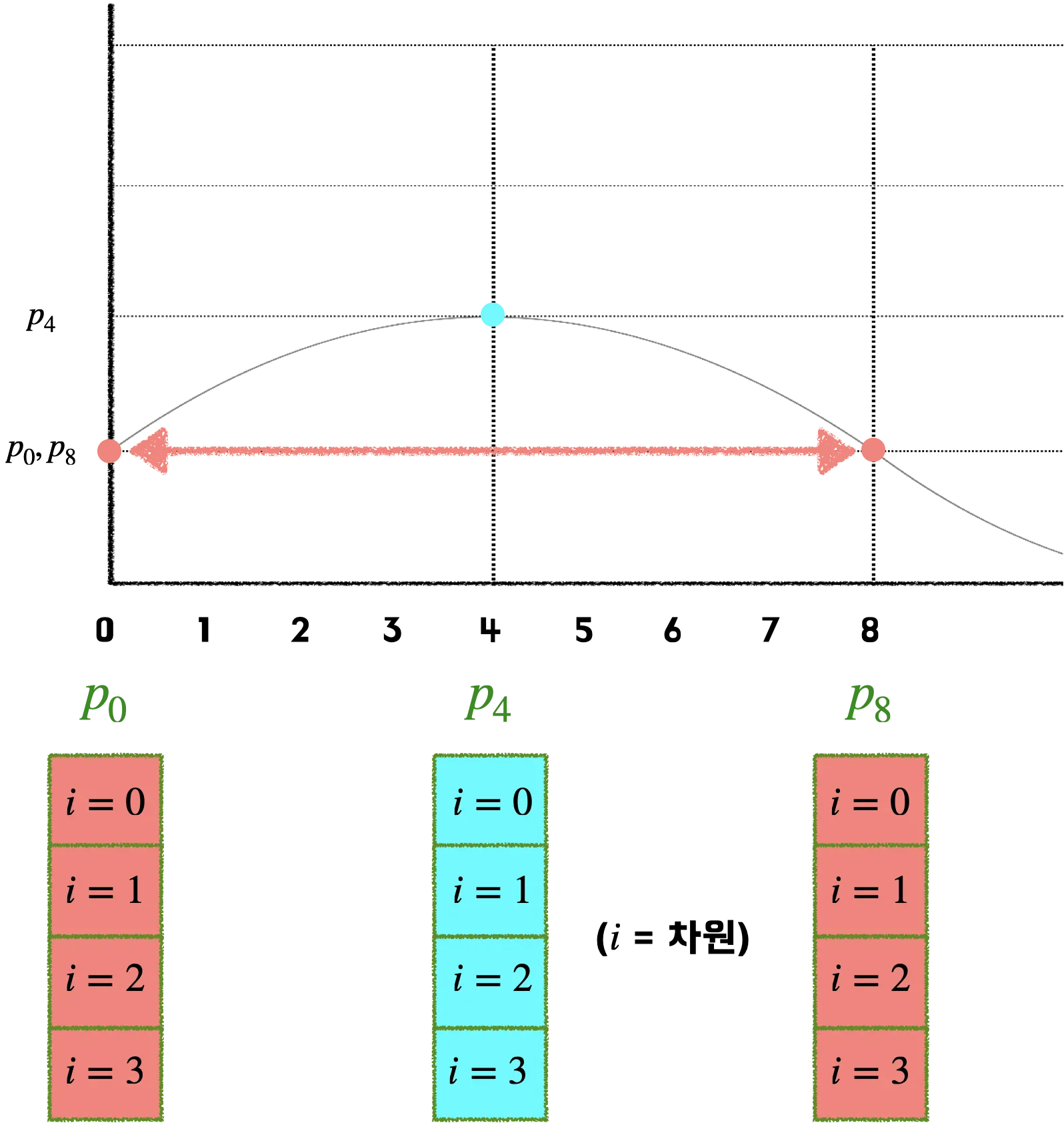예를 들어 아래 그림과 같이 Sine 함수가 주어진다면 1 번째 토큰(position 0)과 9 번째 토큰(position 9)의 경우, 위치 벡터값이 같아지는 문제가 발생한다.