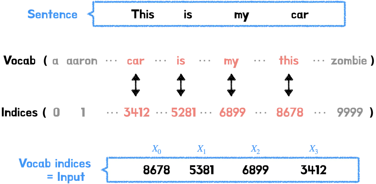 예를 들어 설명하자면, “This is my car” 라는 문장이 주어졌을 때, 문장을 구성하는 각각의 단어는 그에 상응하는 인덱스 값에 매칭이 되고, 이 인덱스 값들은 Input Embedding에 전달된다.