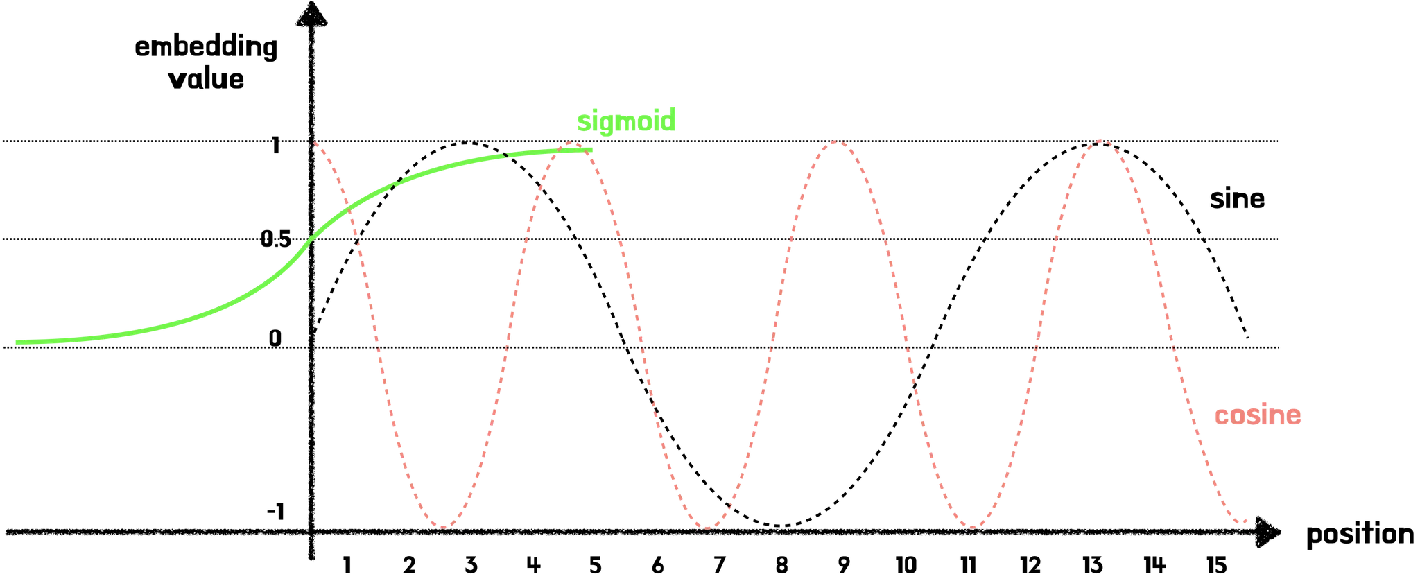 sine & cosine 함수 외에도 일정 구간 내에 있는 함수로는 Sigmoid 함수가 있다. 그런데 왜 sine & cosine 함수를 선택했을까? sine & cosine 함수는 앞서 언급한 것처럼 주기함수이기 때문이다.