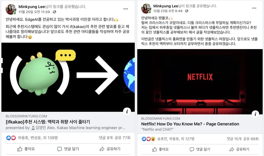 대학원 내내 EdgeAI를 전공해오다가 Next Step으로 추천 시스템을 공부하기 시작했다. 대학 시절부터 사람에 대한 학문에 관심이 많았는데 추천 시스템이야 말로 사람의 취향과 심리를 잘 녹여낸 기술인 것 같아 흥미로웠다. 무엇보다 대부분 기업들의 캐시카우 역할을 하고 있다. 그래서 여전히 수요가 많다. 그리고 내가 그동안 다뤄오고 다루고 싶었던 부분들 역시 잘 적용될 수 있는 분야인 것 같다. 하지만 기업들은 추천 시스템에 대한 발표를 외부에 잘 하지 않는 편이다.(경쟁사가 해당 기술을 통해 돈을 더 많이 벌면 안되니까.) 물론 이 점이 혼자 공부할 때 많은 어려움을 겪게한다. 최근에 쓴 글인 넷플릭스가 그랬다. 해당 글을 쓰기까지 3주 정도 걸렸다. 그리고 수많은 시간 울부짖고 넷플릭스 추천엔진 공부를 시작한 나를 자책했다(내가 시작했지만 관두기도 싫었던 이상한 감정이란 ). 어찌되었든 한 파트를 써보고 나니 향후 어떤 방식으로 넷플릭스 추천시스템을 공부하면서 정리해갈 지 감이 잡히긴 했다. 그리고 알게된 사실이, 연구할 때는 다양하고 복잡한 딥러닝을 적용시켜보고 개선해가지만, 현업에서는 사실 복잡한 문제도 생각보다 단순하게 해결되는 경우가 많다는 점이다. 멋지고 화려해보이는 딥러닝 기술을 공부하는 것도 좋지만 어느 기업이나 다 써봤고 써보고 있을 법한 방식들을 익히고 그 안에서 하나씩 바텀업으로 쌓아가봐야겠다.