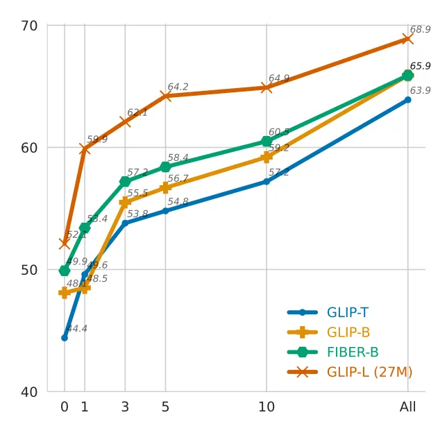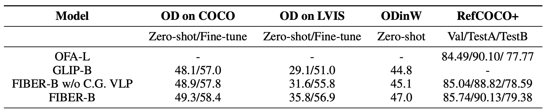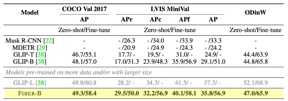 ⇒ coarse-grained pre-training이 없다면, FIBER와 GLIP 차이는 아키텍처 차이일 뿐인데. 결국 제안한 아키텍처의 효율성을 보여줌