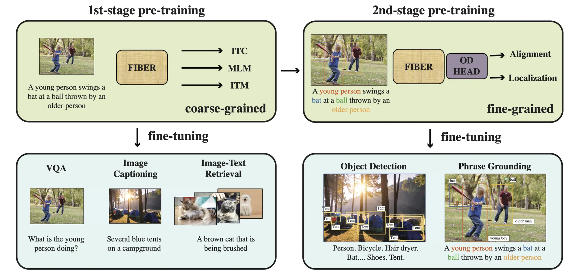 Uni-modal backbone 뒤에 fusion을 위한 트랜스포머 레이어가 있는 기존 모델들과는 다르게, FIBER는 이미지와 텍스트 backbone에 Cross-attention을 넣어 Multimodal-Fusion model을 제안했고, 저자는 coarse-grained image-level을 통해 학습한 다음, region-level을 통해 더 세분화된 region-level의 이해를 얻는 새로운 VLP 전략을 제안했습니다.