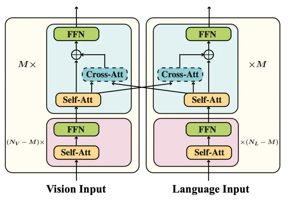 Insert Cross-Attention blocks into the top 6-blocks of vision & text encoder