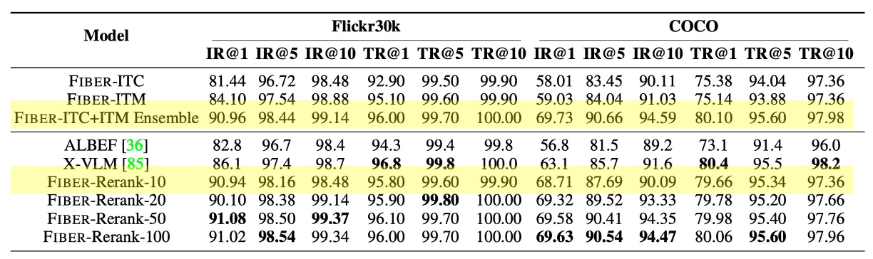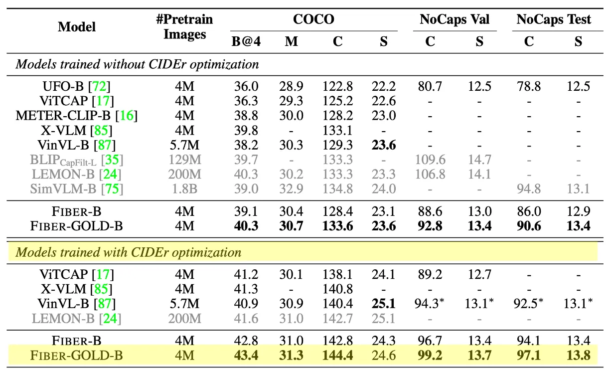 기본 크기 모델에 대해 COCO에서 CIDEr 점수를 설정. FIBER가 캡션을 수행하도록 사전 학습하지 않았다는 점을 고려했을 대, 엄청난 일반화 능력을 입증