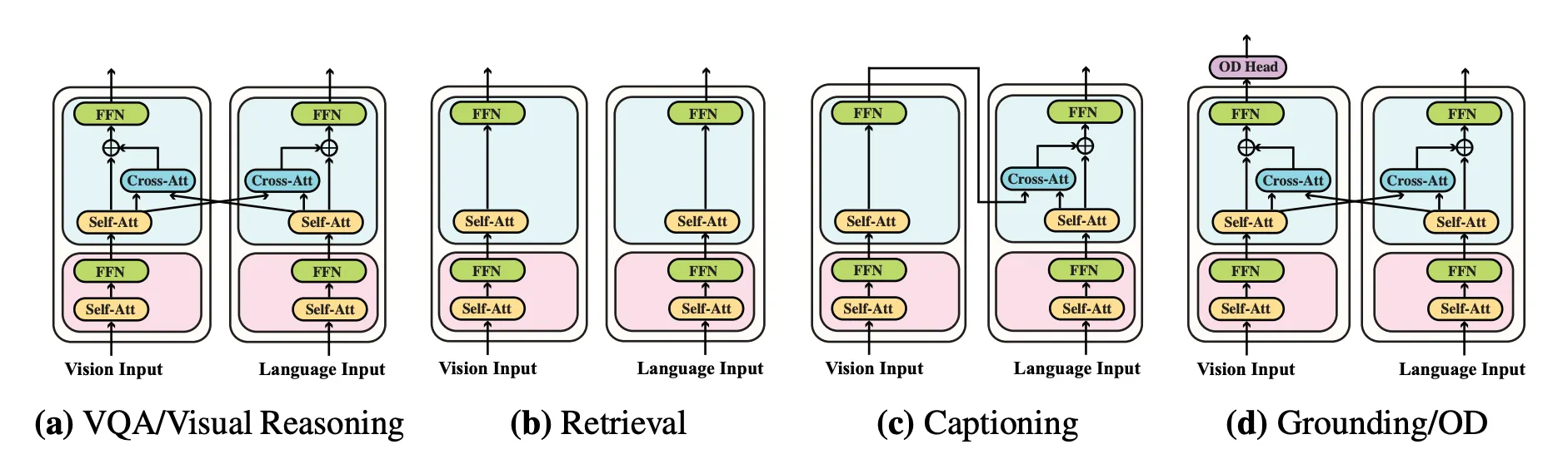 cross-attention module을 끄고 키는 방식으로 dual encoder(fast image retrieval)와 fusion encoder(VQA, Captioning) 간의 빠른 전환을 가능하게 함