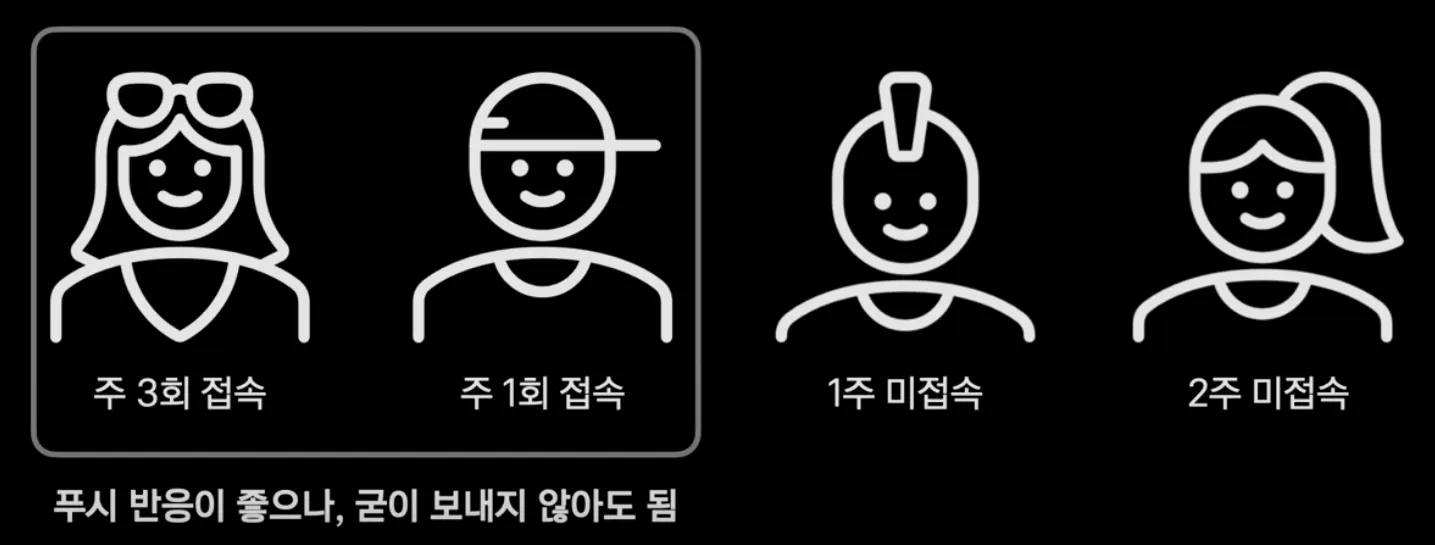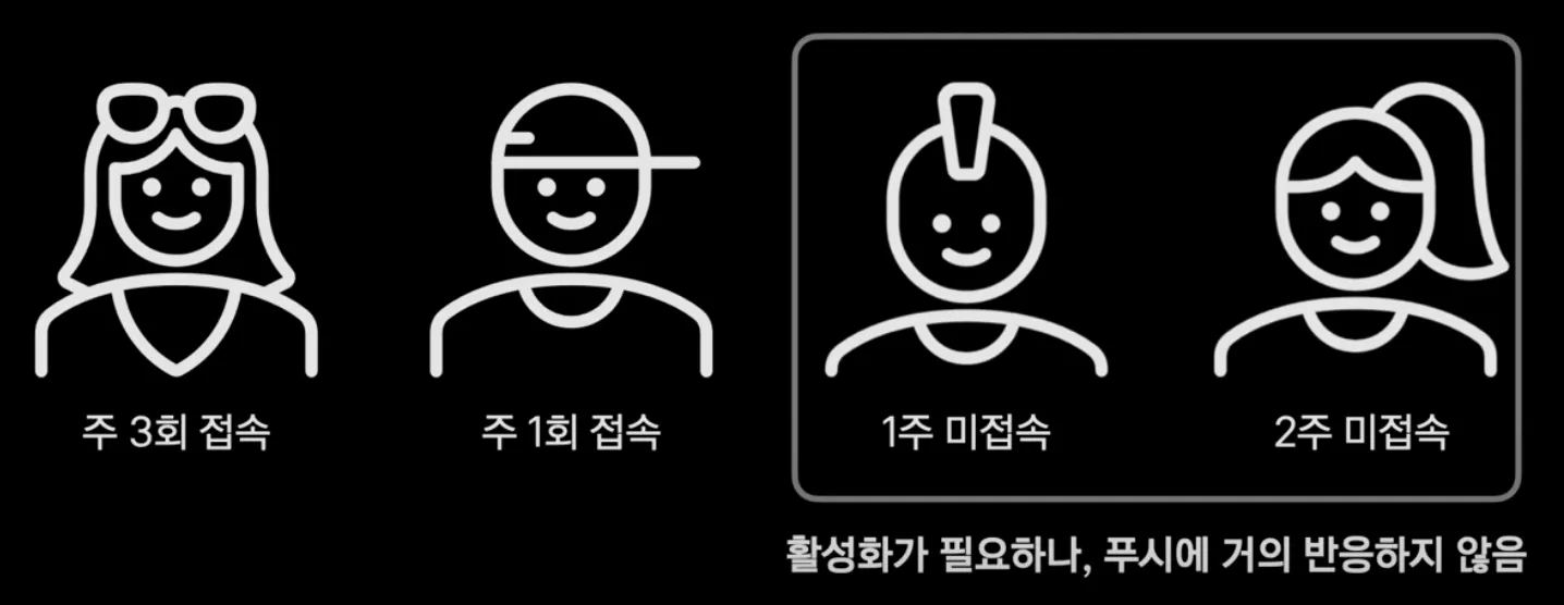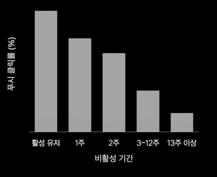 이처럼 비활성 기간 늘수록 푸시 클릭률 떨어진다.