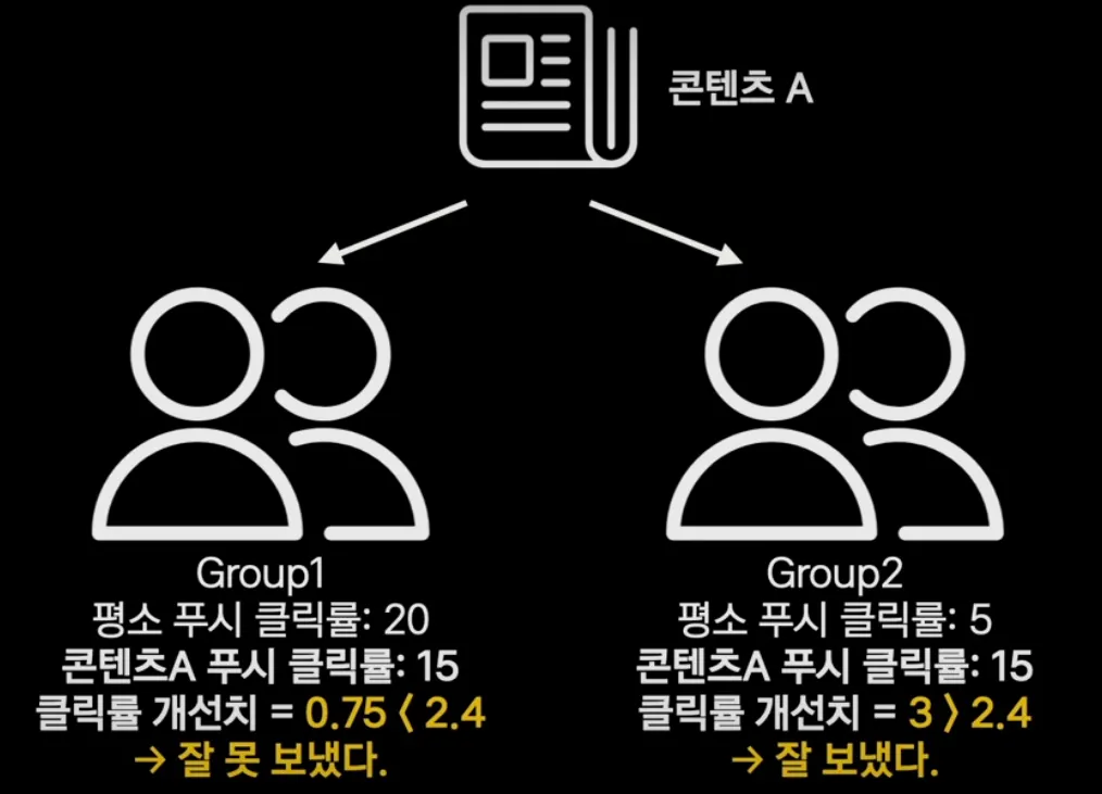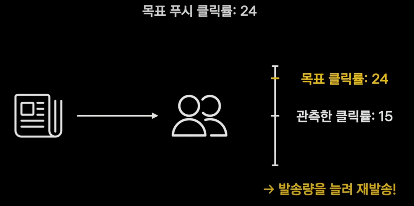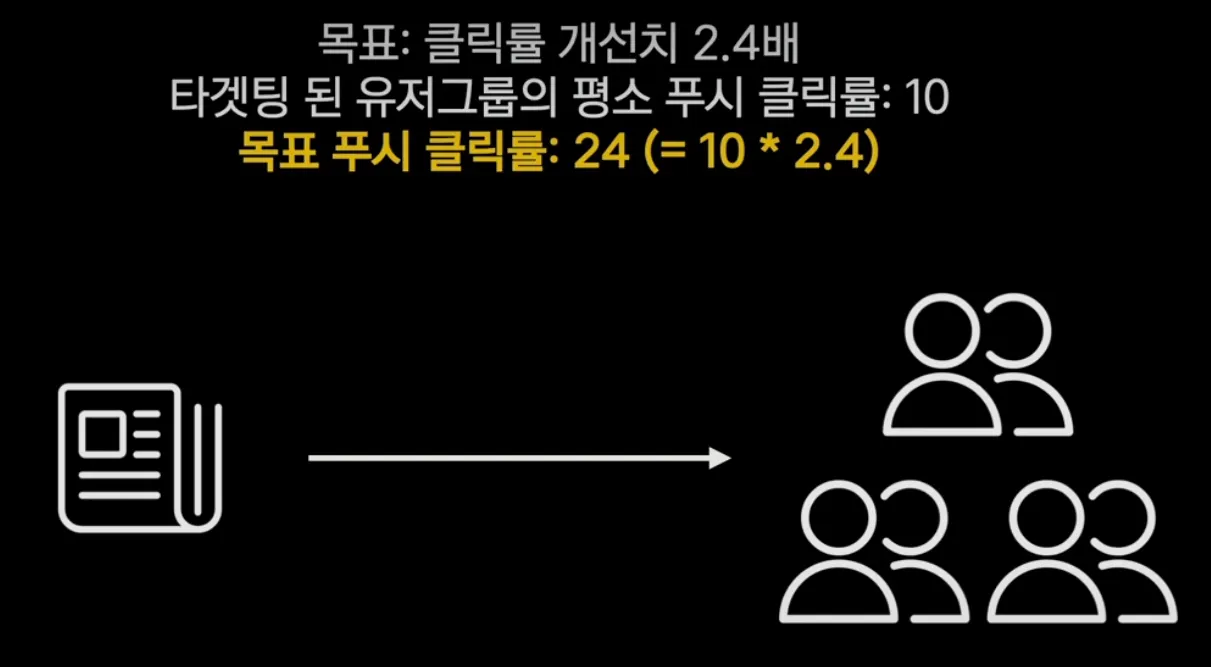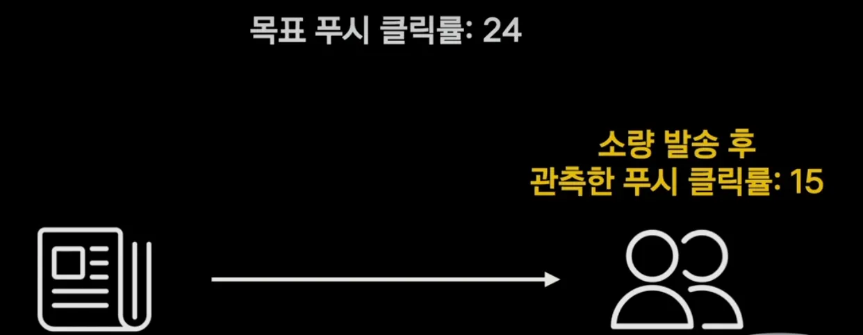 평소 푸시 클릭률이 10인 유저 그룹을 대상으로 CTR 개선치 2.4배를 세우면 CTR이 24가 되어야 좋다.