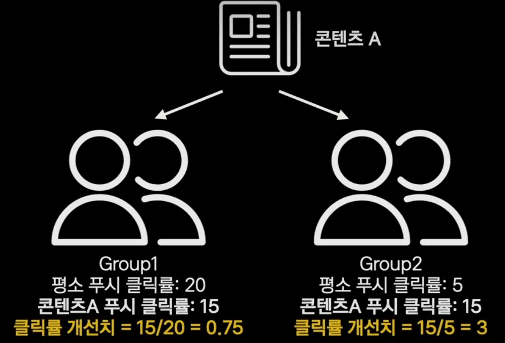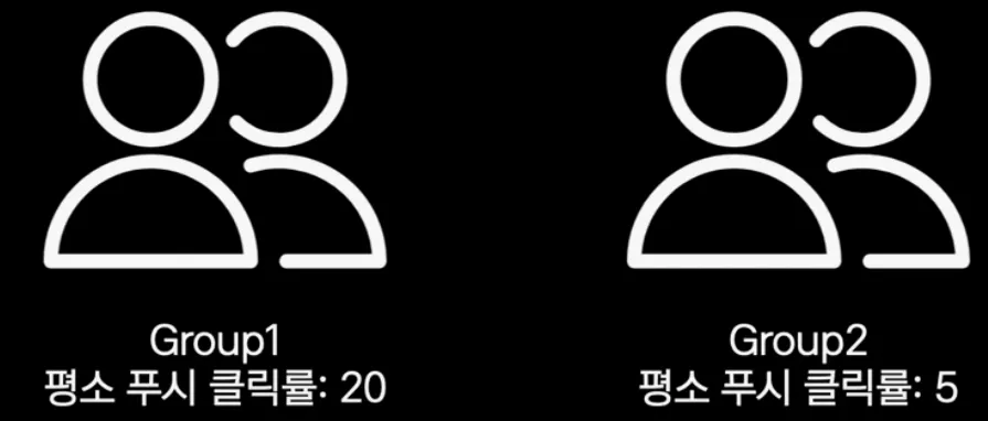 평소 푸시 클릭률이 20과 5이던 두 그룹에 컨텐츠 A를 보냈다.