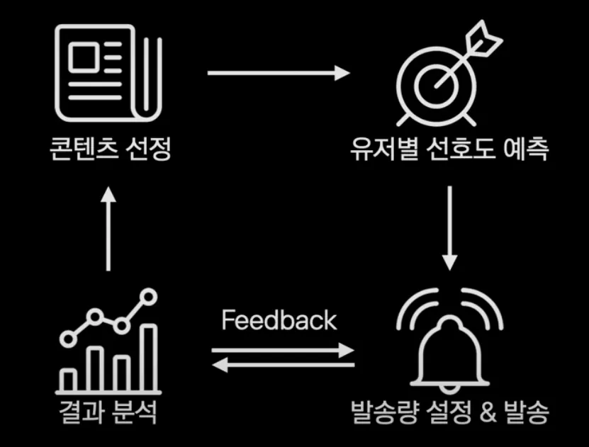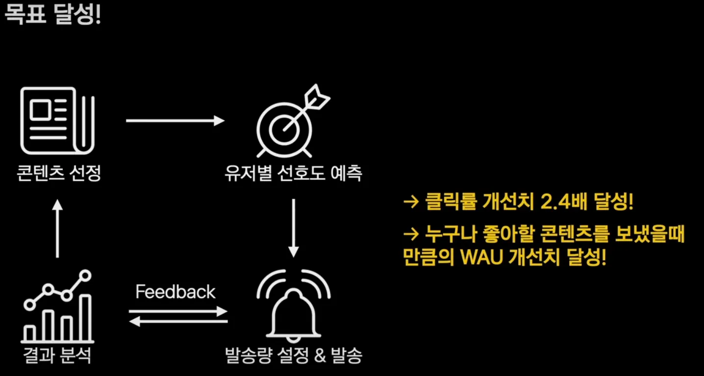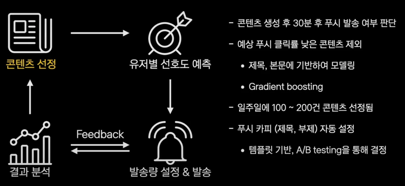 문제를 풀기위해 푸시할 콘텐츠 선정. 유저별 선호도 예측. 발송 모수 설정 및 발송까지의 모든 푸시 과정을 머신러닝 기반 시스템으로 자동화한 프로젝트를 소개하고 있다. 이 프로젝트에서 풀고자 했던 문제와, 그 문제를 해결하기 위한 시스템을 어떻게 설계했는지에 대한 발표이다.