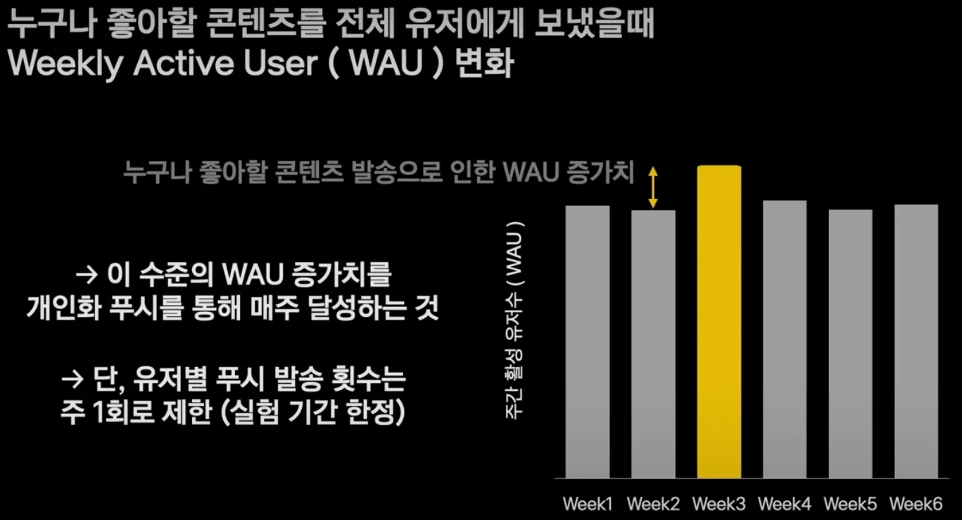 우리가 풀려고 하는 문제는 "누구나 좋아할 컨텐츠를 보냈을 때의 성과(WAU)를 누구나 좋아할 컨텐츠가 없더라도 꾸준히 내고 싶다." 이다.