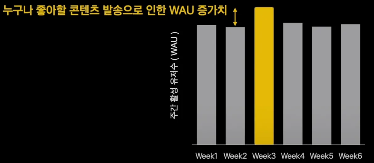 누구나 좋아할 컨텐츠를 전체 유저에게 보냈을 때 WAU 변화는 다음과 같다.