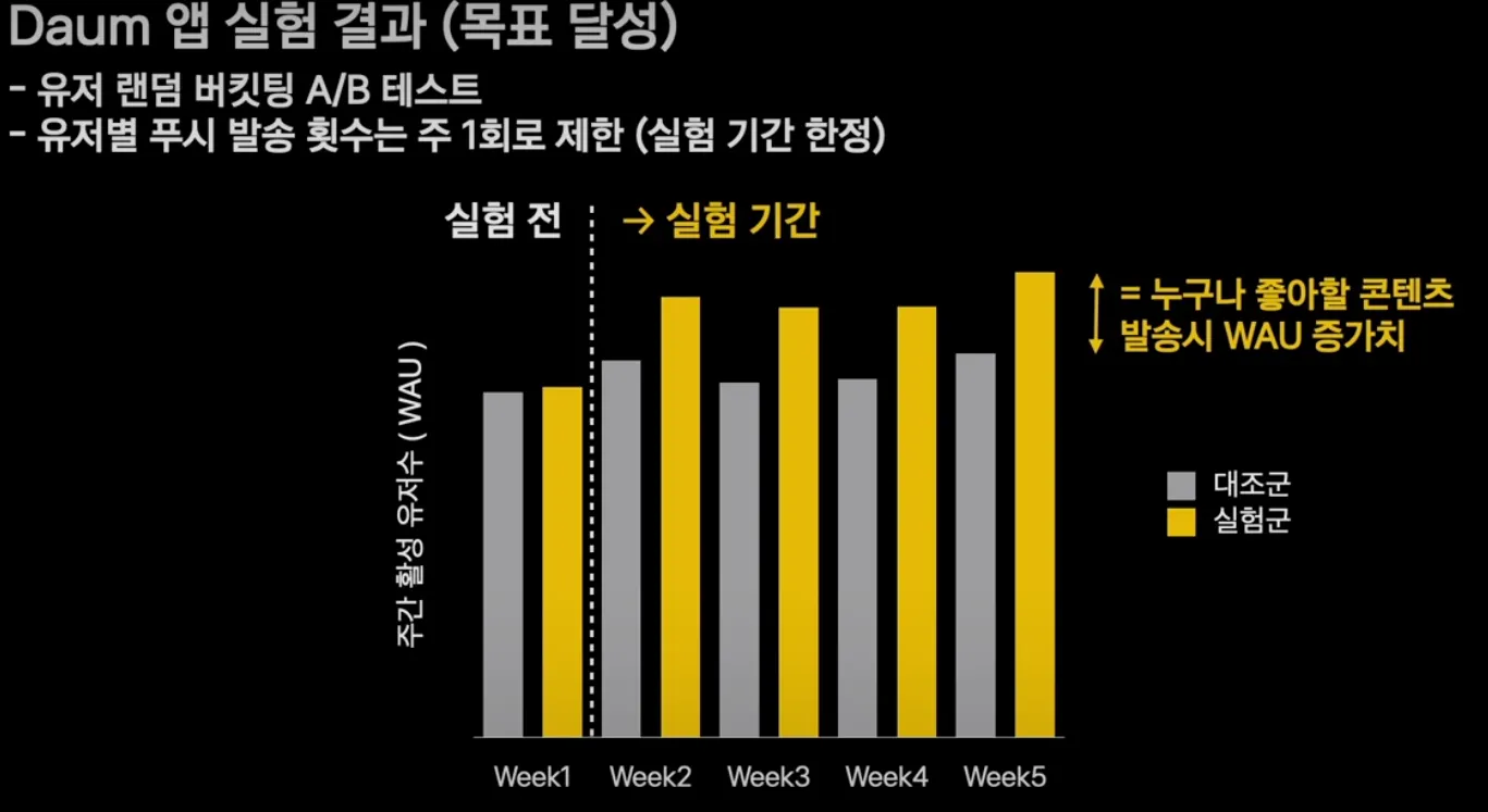 여기서 푸시를 보냈을 때 성과가 있었다라는 말은 주간 활성 유저 수(WAU, Weekly Active User)에 기반한다. 이때 WAU란, 일주일 동안 해당 앱을 1회 이상 접속한 사람 수이다.