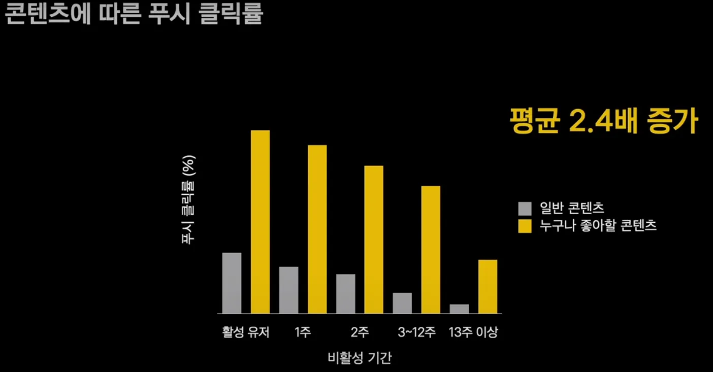 누구나 좋아할 콘텐츠를 푸시로 보내면 일반 콘텐츠에 비해 클릭률이 "평균 2.4배 증가"한다. 또 이는 증가한 만큼 그대로 성과로 이어진다.
