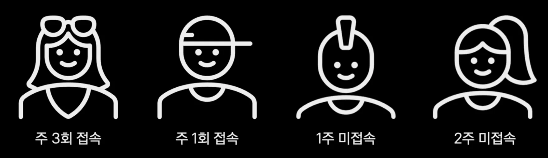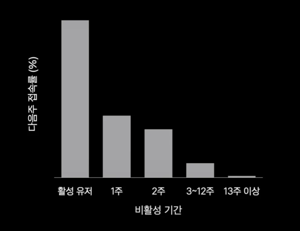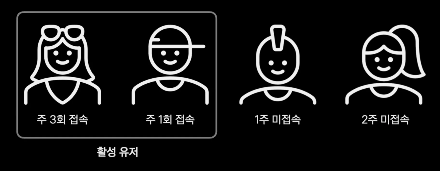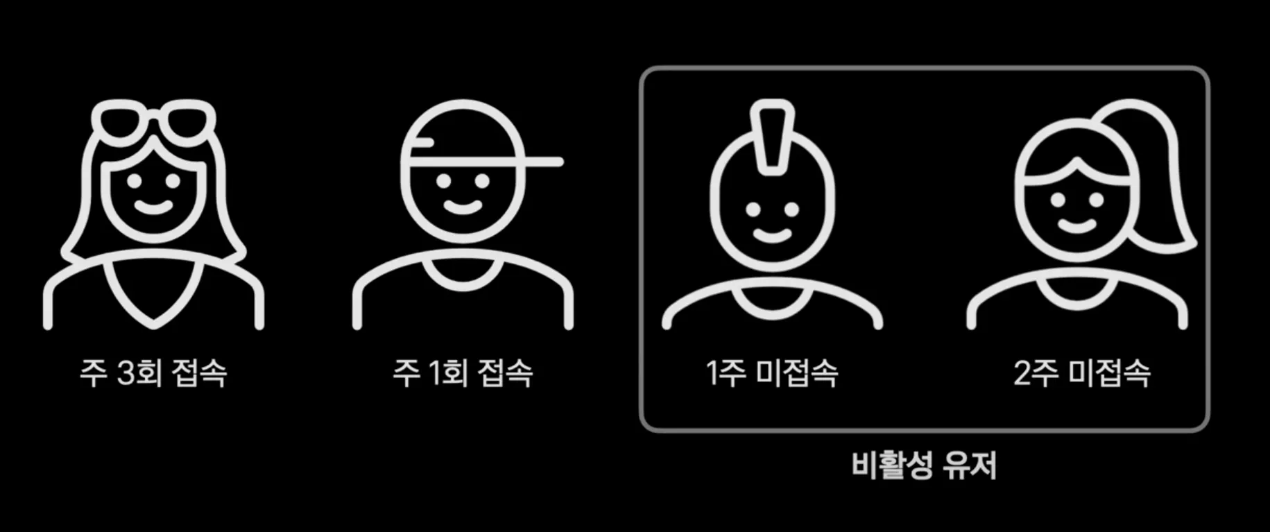 활성상태라는 의미는 이번 주에 한 번 이상 앱에 들어왔다. 따라서 여기서 활성성태 유저는 주 3회 접속과 주 1회 접속한 사람이다. 반면 1주 미접속과 2주 미접속은 비활성 상태, 즉 비활성 유저에 해당된다.