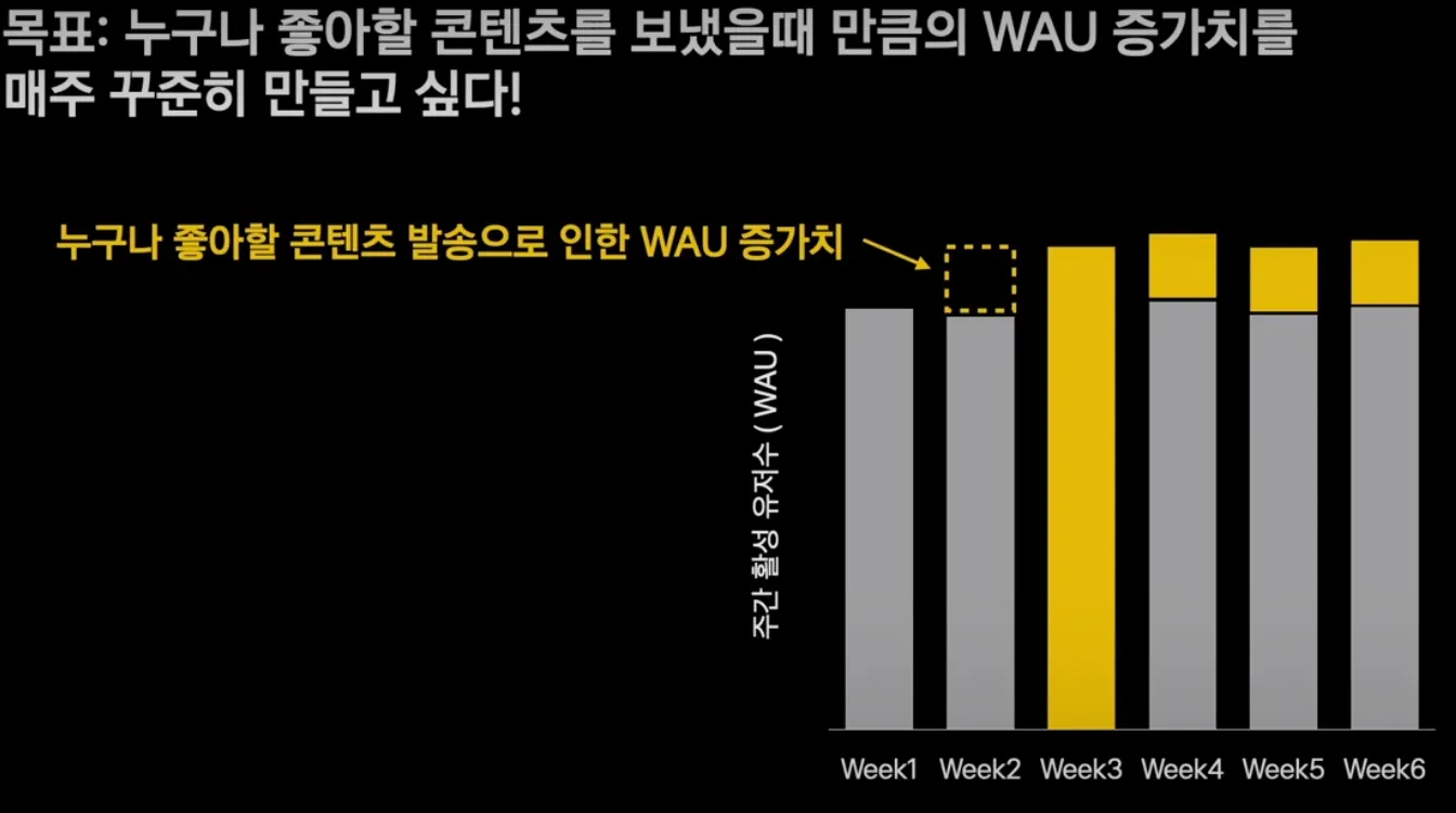 전략목표는 일반 콘텐츠로도 누구나 좋아할 컨텐츠를 보냈을 때와 같은 수준의 WAU 증가치 달성!