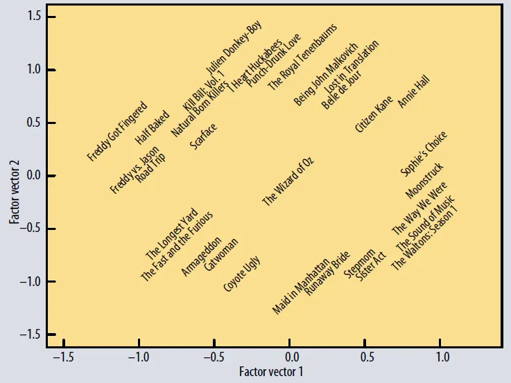 Netflix 사용자 영화 행렬을 분해하면 영화 선호도를 예측하기 위해 가장 설명적인 차원을 찾을 수 있다. 행렬 분해에서 처음 몇 가지 가장 중요한 차원을 식별하고, 새로운 공간에서 영화의 위치를 탐색 할 수 있다.