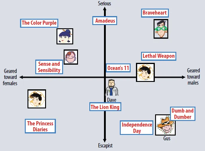 첫 번째 요소 벡터(X-axis)는 남성, 청소년 관객을 고려한 저속한 코미디와 공포 영화이고 반대편에는 진지한 음색과 강한 여성 주연이 있는 드라마나 코미디가 위치한다.