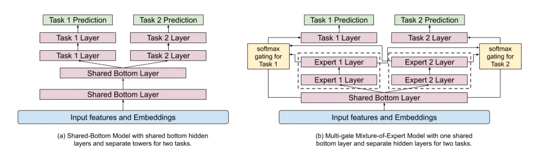 MoE layer는 입력에서 모듈화된 정보를 학습하는데 도움을 줄 수 있다. 따라서 유튜브 랭킹 시스템의 경우 MMoE 모델(그림 b)을 도입했다. MMoE 모델을 도입하면, 입력 레이어 또는 하위 은닉 레이어에서 직접 사용할 때 Multimodal feature space을 더 잘 모델링 할 수 있다는 장점이 있다.