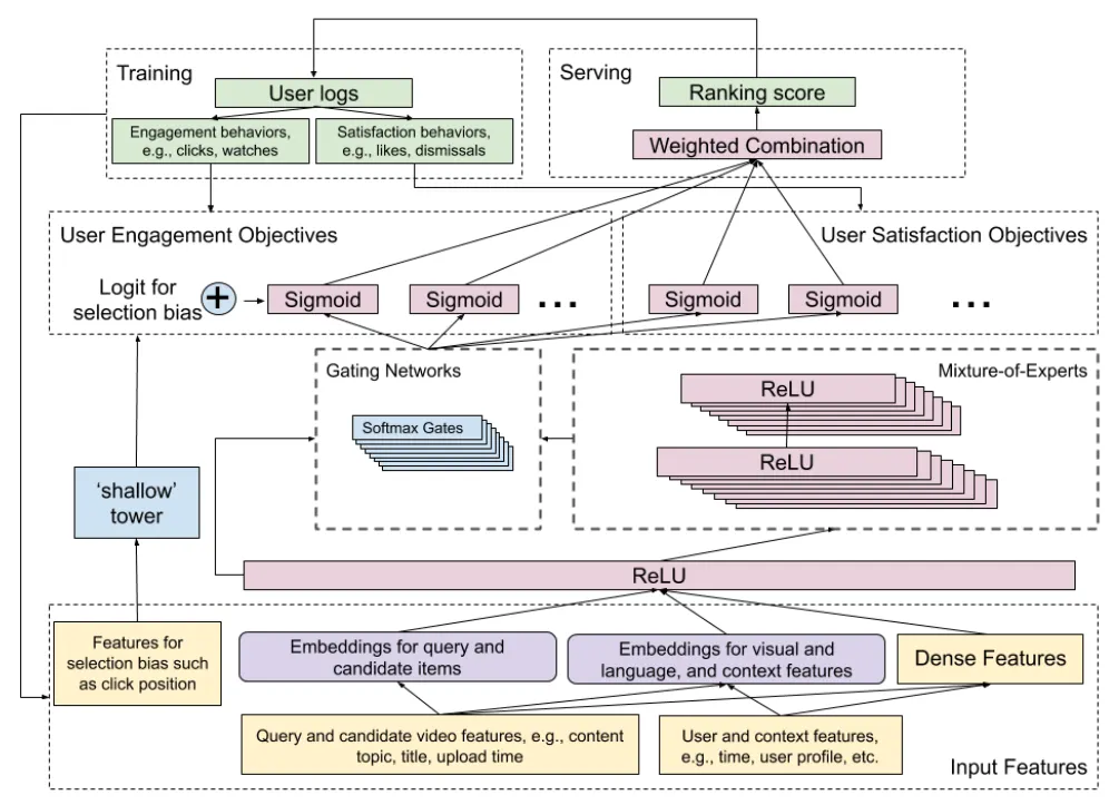 간략하게 모델에 대하여 설명하자면, 우선 여러 목표들을 참여 및 만족도 표현으로 그룹화한다. 그후, 여러 유형의 사용자 행동을 학습하고 추청하기 위해, MMoE를 사용하여 잠재적으로 혼란스러운 목표들을 공유하기 위해 필요한 매개변수를 자동으로 학습한다.
