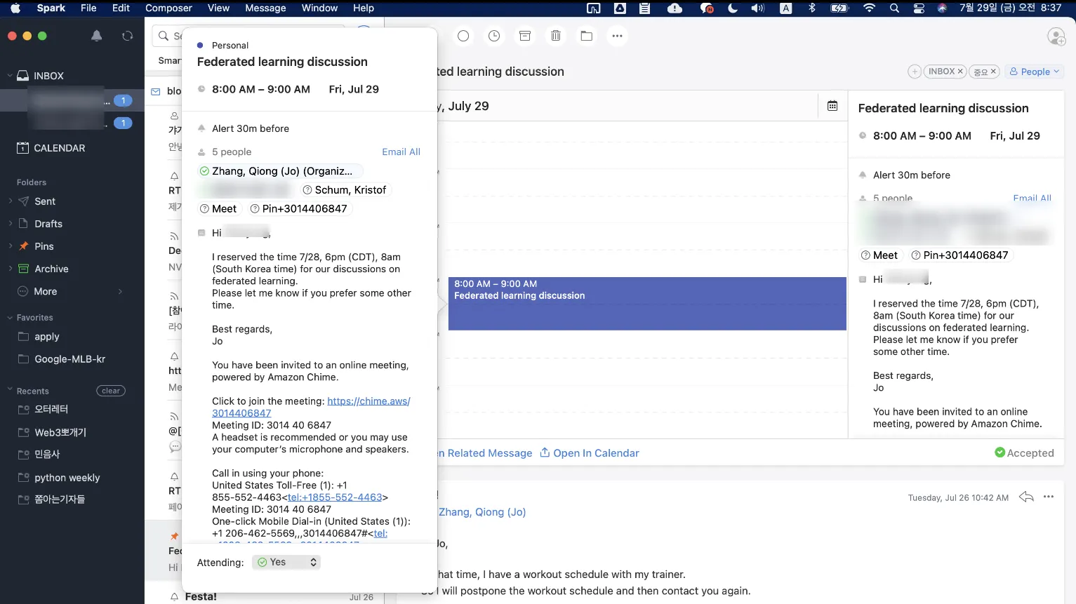 학회에서 알게된 아마존 ML 연구원님과 온라인 미팅을 했었다. Federated Learning에 대한 연구내용과 이를 AWS에서 제공하는 패키지로 만드는 방향과 아키텍처 및 코드에 대한 미팅이었다. 내가 100% 준비된 상태가 아니었던 탓에 조금 버벅거렸지만 내가 좋아하는 걸 같이 좋아해주는 사람들과 같은 목적으로 대화를 한다는 즐거움을 다시 느낄 수 있었다. 또한 기회는 준비된 사람에게만 오는게 아니라 준비 중인 사람에게도 올 수 있다는 걸 알게되었다.