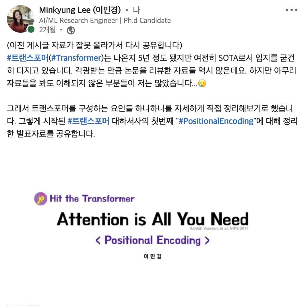 컨퍼런스에 다녀온 후 머신러닝 논문 리뷰를 다시 시작하면서 트랜스포머 논문 깊게 파헤치기 시리즈를 작성하기로 다짐했다. 더불어 글을 쓰고 난 뒤 해당 내용을 슬라이드로 만들어서 링크드인에 공유하기도 결심했고 총 3부작이 될 시리즈 중 글또 7기 동안에 간신히 한 슬라이드를 만들어서 공유할 수 있었다.